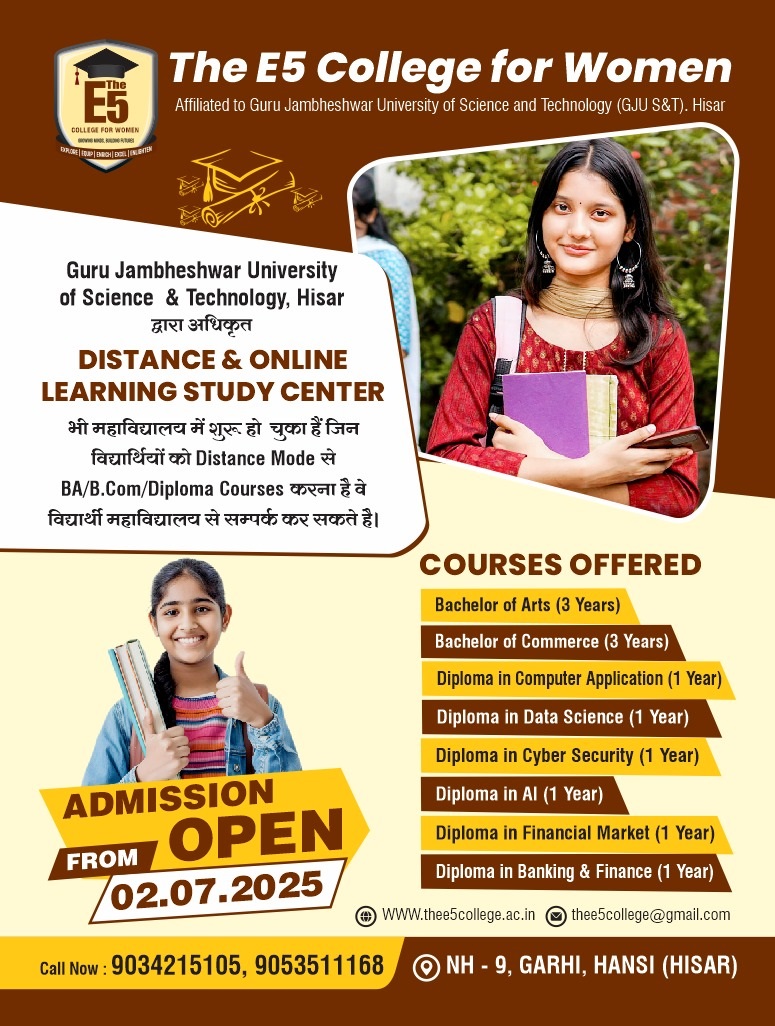 Welcome to The E5 College for Women, Garhi, Hansi, a distinguished institution where excellence is not just pursued—it is cultivated, lived, and celebrated In a world driven by rapid change, education must be more than the transmission of knowledge. It must inspire vision, build character, and ignite a lifelong passion for learning. At The E5 College for Women, we are committed to shaping not only skilled professionals but also responsible global citizens who lead with wisdom, empathy, and purpose......